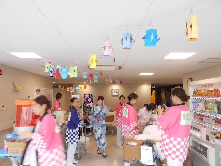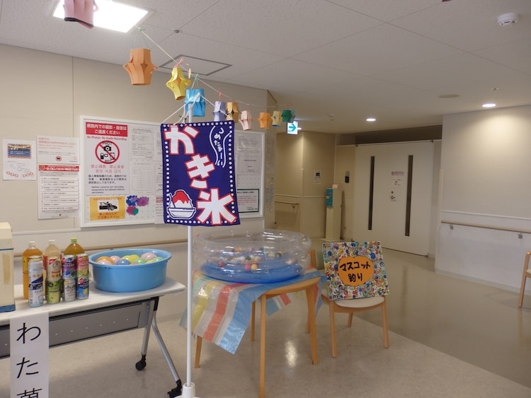 お祭りと言えば、縁日も楽しみのひとつです。かき氷やたこ焼きなど食べ、私たちスタッフも浴衣姿で参加し、夏祭りの雰囲気を盛り上げました。患者さん、御家族のたくさんの笑顔をいただき夏祭りのすてきな思い出ができました。