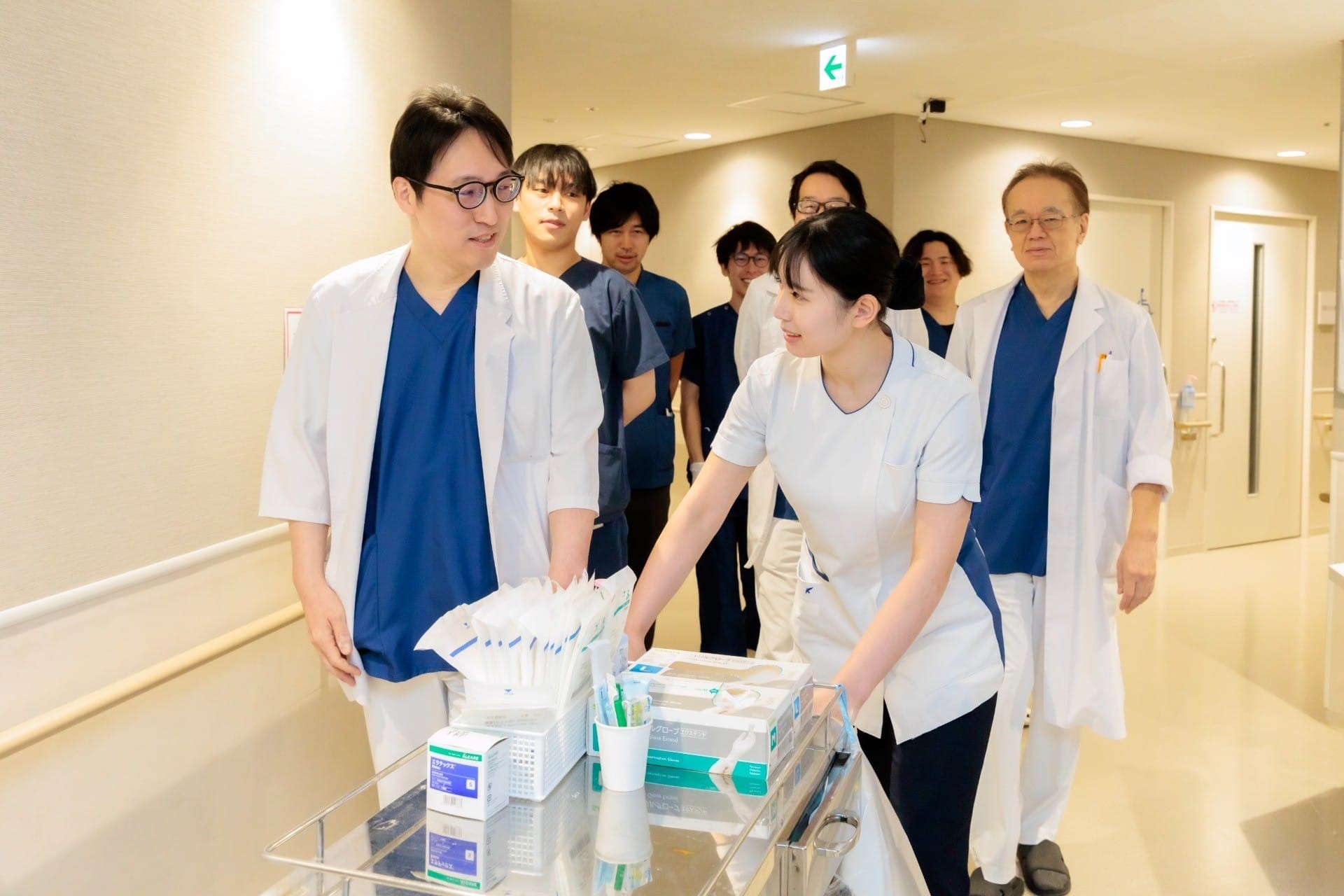 手術前後の患者さんやそのご家族に対し、不安の軽減や手術後の疼痛緩和、および合併症予防に向けた看護を行っています。人工肛門造設後の患者さんに関しては、病棟看護師が退院後も訪問し、ストーマ管理においてトラブルがないかなど訪問指導を実施しています。経験年数の異なるスタッフが協力し合い、患者さんが安心して治療に臨み、地域でその人らしく生活を続けられるよう支援する事を目指しています。