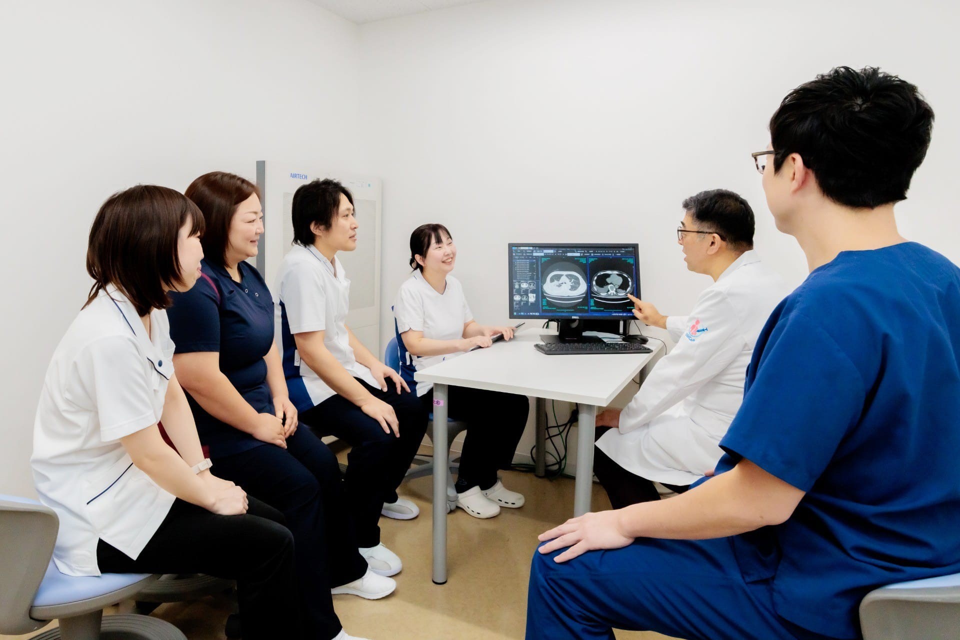 6北病棟は、泌尿器科、歯科口腔外科、眼科、形成外科、小児科の混合病棟です。泌尿器科では前立腺肥大や尿管結石症、悪性疾患に対して手術目的に入院される患者さんが多く、前立腺がんや膀胱がんに対しては低侵襲で行えるダヴィンチ手術を行います。また、泌尿器科の看護はデリケートな部分が多く、患者さんの羞恥心に配慮したケアが重要になってきます。その他の診療科も手術目的が多く、周術期における異常の早期発見と対応、術後のリハビリ介入を行っています。入院から退院まで安心して入院生活が送れるように、患者さんやご家族一人一人に寄り添い、退院後の生活を見据えてQOLの維持・向上が図れるような看護を目指しています。